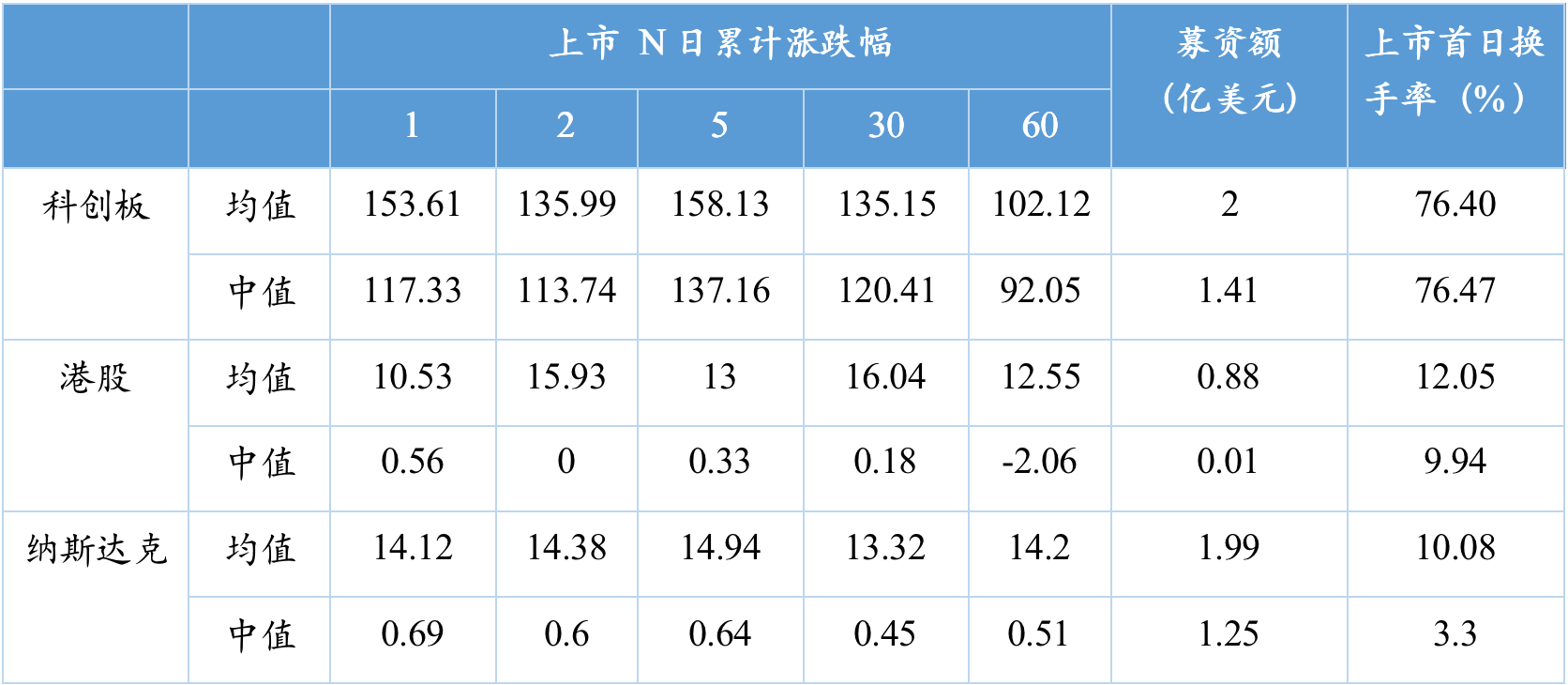 科创板目前并未出现与成熟注册制市场相同的交易特征:第一,科创板首日涨幅的均值达到153.61%,中值为117.33%,显著高于其他成熟注册制市场。第二,上市后一个月内,科创板仍普遍地保持较高的累计涨幅,显著区别与成熟注册制下的“一半上涨”。第三,从换手率上看,首日大幅上涨导致科创板首日交易明显更为活跃,首日换手率中值为76.47%,几乎八倍于成熟注册制市场。第四,从募资额上看,通过汇率调整,科创板IPO募资规模均值为2亿美元,高于2019年港股IPO募资额均值(0.88亿美元),与纳斯达克市场IPO募资额(1.99亿美元)基本相当。