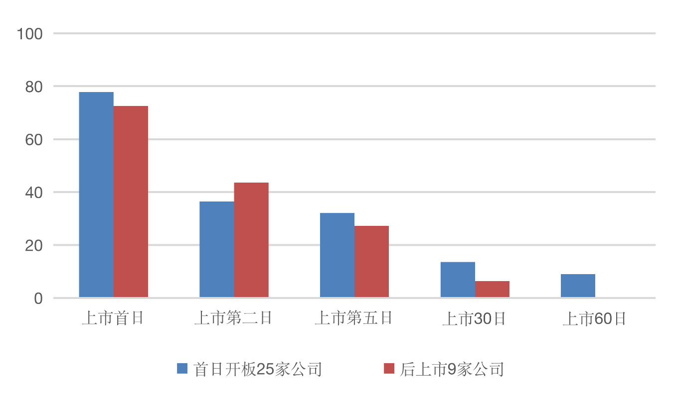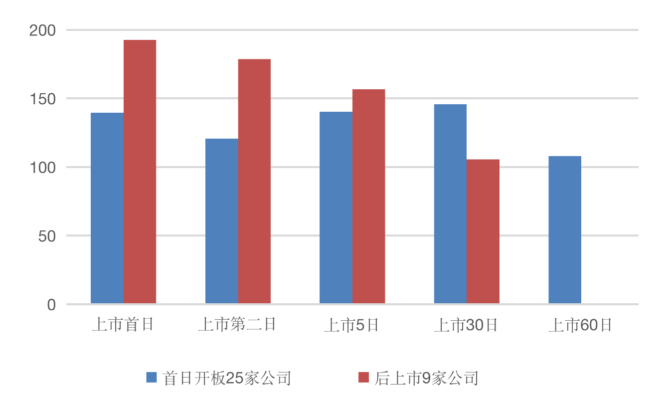 数据来源:Wind,上市后N个交易日相对于首发价格的累计涨幅,后上市9家公司暂无60交易日数据