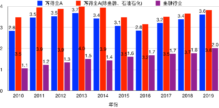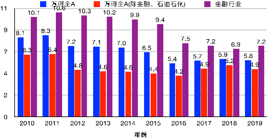 图表4:2010-2019年万得全A、万得全A(除金融、石油石化)和金融行业中报净资产收益率(%)