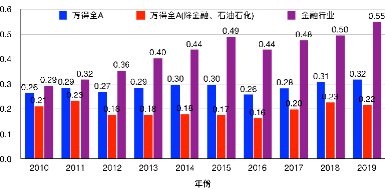 总体看,万得全A的中报净资产收益率在2010-2019年间的走势可以分为三个阶段。万得全A在2010、2011年的中报净资产收益率分别是8.1%、8.3%;第二阶段是从2012至2016年,中报净资产收益率是逐年下降的,从7.2%下降到了5.4%;第三阶段是从2017至2019年,中报净资产收益率从2016年的5.4%上升到了2017年的5.7%,再到2018年的5.9%,但2019年又降到了5.8%。