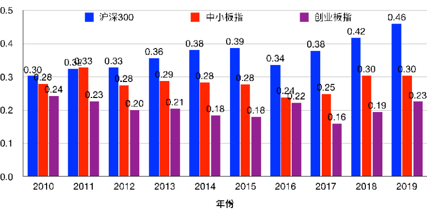 沪深300指数是由沪深两市中市值大、流动性好的300只股票组成,每年调整2次样本股,于2005年4月8日推出。中小板指(即中小企业板指数)和创业板指(即创业板指数)分别是由中小企业板和创业板上按流通市值和流动性排名前100的股票组成的指数。中小板指数在每年1月、7月的第一个交易日调整样本股,指数发布于2005年6月7日。创业板指数在每年6月、12月的第二个星期五的下一个交易日调整样本股,指数于2010年5月31日推出。图表3画出了2010-2019年沪深300、中小板指和创业板指的中报每股盈利。