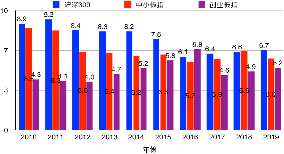 中小板指的中报净资产收益率在2010、2011年分别是8.5%、8.3%,自2012年开始就都低于7%了,在2016、2017年甚至降到了6%以下,分别是5.7%、5.9%。中报净资产收益率在2018年上升到了6.6%,但与沪深300指数不同的是,在2019年又下降到了6%。