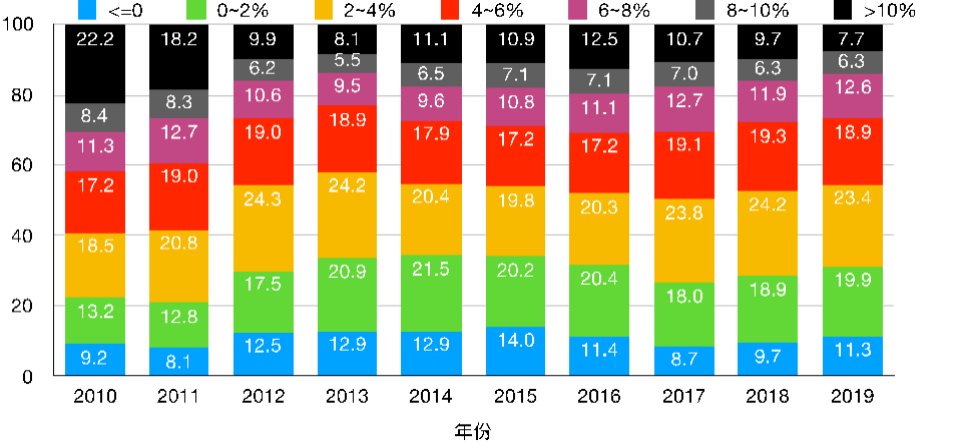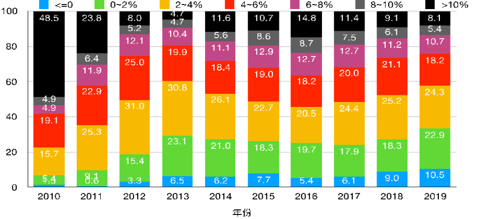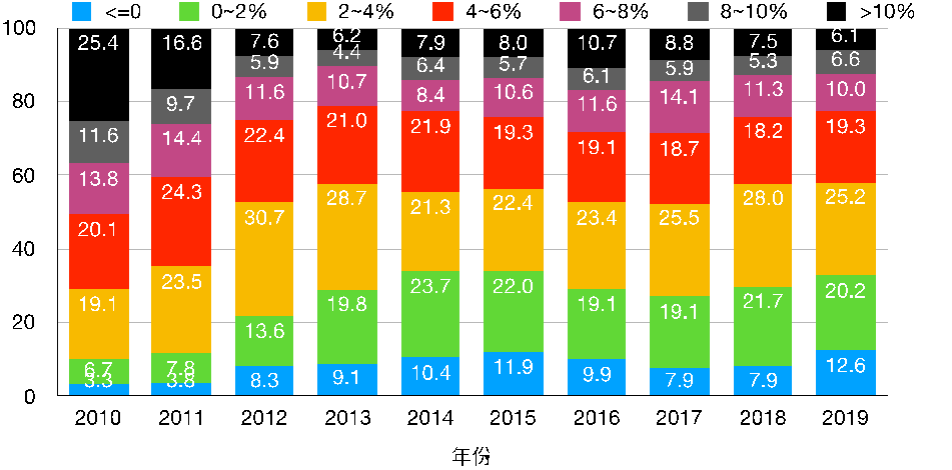 图表6:A股市场2010至2019年中报净资产收益率分布