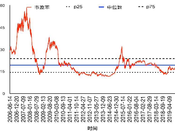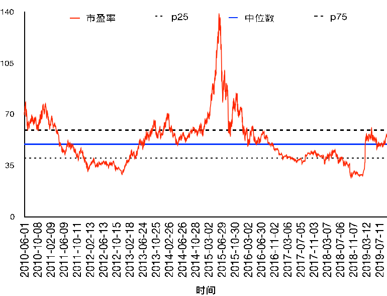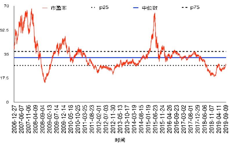 图表10分别画出了中小板指(上栏)、创业板指(下栏)的市盈率以及对应的25%分位数、中位数和75%分位数。在计算市盈率分位数的时候,中小板指使用的是从2006/12/27至2019/9/12的数据,而创业板指使用的是从2010/6/1至2019/9/12的数据。