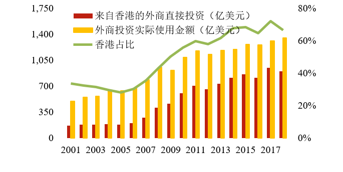 从金融视角看,一方面香港是大陆接受外商直接投资(FDI)最大的来源地,且占比不断增长。商务部数据显示,2001年来自香港的FDI占大陆整体FDI的比重为33.66%,随后该比例不断增长。2018年,大陆接受香港的FDI为899亿美元,占FDI总量(1349.7亿美元)的66.61%。2019年上半年,大陆接受香港FDI为500.9亿美元,占比超过70%。大陆整体接受的FDI来自香港的比重非常之高,主要原因在于香港作为外商直接投资内地的重要平台,存在大量的国际资本过境投资。