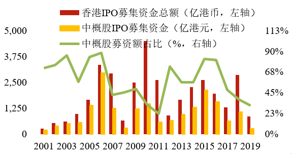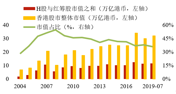 另一方面,香港资本市场是中国企业获得国际资本的重要渠道。2019年5月23日,美国总统特朗普称“在看到中方做出美意愿下的根本性的改革之前,要停止所有中国企业在美国IPO”,贸易战持续发酵给中国企业赴美国上市蒙上一层阴影。在赴美上市可能受限的情况下,香港成为中国企业吸收国际资本的重要资金池。中概股在香港上市主要有H股与红筹股两类,H股指注册地在中国内地、上市地在香港的外资股;红筹股指在中国境外注册、在香港上市的带有中国大陆概念的股票。截至2019年7月末,中资概念股票总计为452只,总市值为11.53万亿港币。