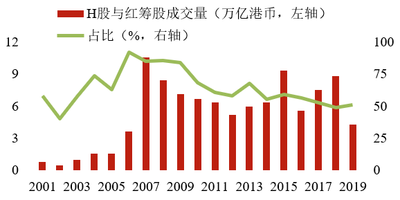 维度二是交易量。金融市场中产生均衡价格的关键是活跃的市场成交。截至2019年7月末,中概股(包含H股与红筹股)成交量为4.28万亿港币,占香港股票市场整体成交的50.8%。
