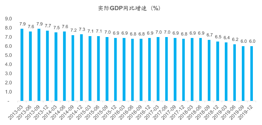 根据国家统计局公布数据,2019年全年中国实际GDP增速为6.1%,相较前一年同比下降0.6个百分点,如果从分季度数据看,呈现逐季环比走低态势,截止到三季度已经下降到6.0%,已经贴近年初政府工作报告制定的6.0-6.5%的经济增长预期目标的下限。