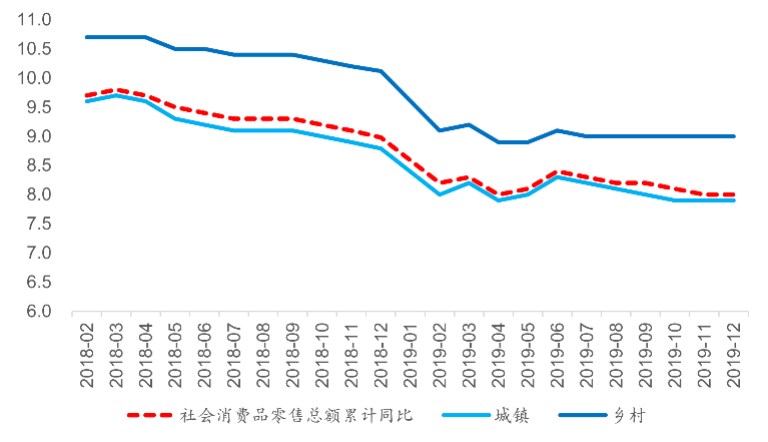 消费增速继续温和放缓,社会消费品零售总额同比增速在2019年同比降低1个百分点到8.0%。从限额以上企业数据看,对整体消费盘子影响最大的汽车类消费的下行态势已经有所缓解,同比降幅从2018年的-2.4%收窄到-0.8%。