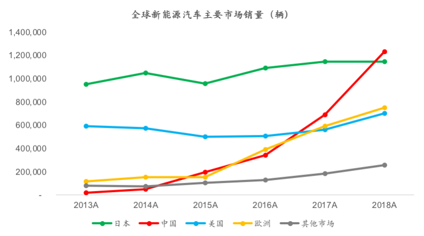 新能源汽车行业可以看作是中国制造业崛起的一面旗帜,得益于政府持续多年的大力推广和包括补贴、免税、路权优势等在内的一系列政策支持,中国新能源汽车市场规模总量快速增长,根据Marklines统计数据,中国新能源汽车销量从2013年的1.9万辆迅速增长到2018年的122.9万辆,5年年均复合增长率达到130%,远远超出同期世界平均水平的18%,中国在2018年已经成为全球最大的新能源汽车市场。