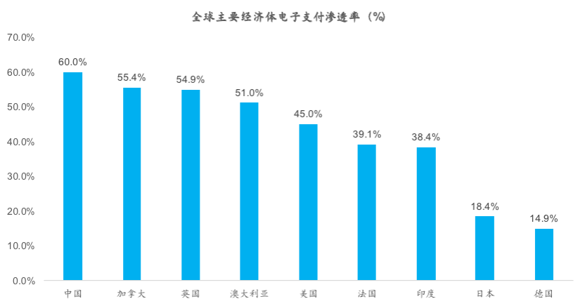 图表9:中国在全球主要经济体中电子支付渗透率领先