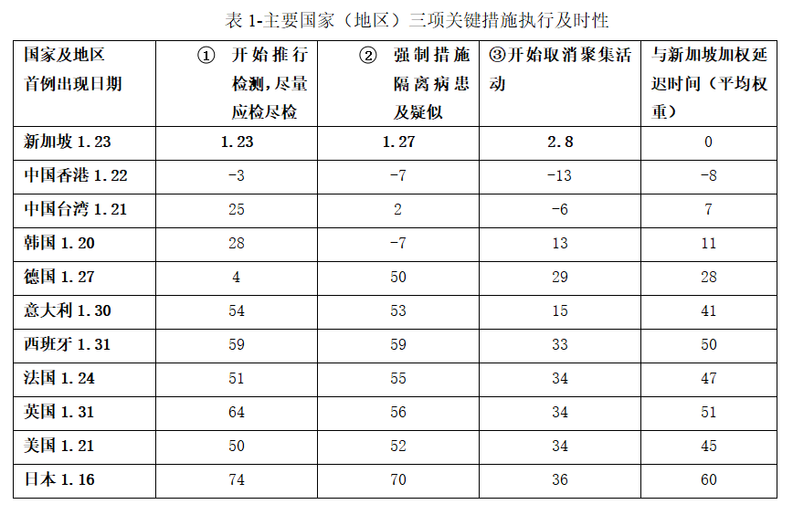 综上所述,我们对主要国家(地区)各项政策出台的时间做了汇总,并以新加坡为基准推算评估了各国(地区)反应的及时性(见表1)。