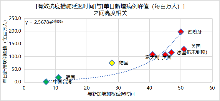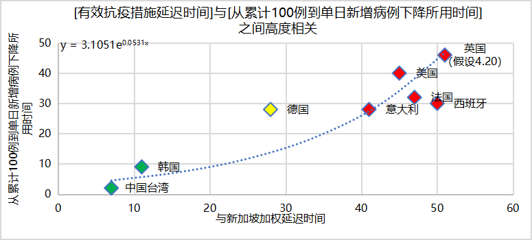 图1-抗疫措施延迟时间与单日新增病例的相关性
