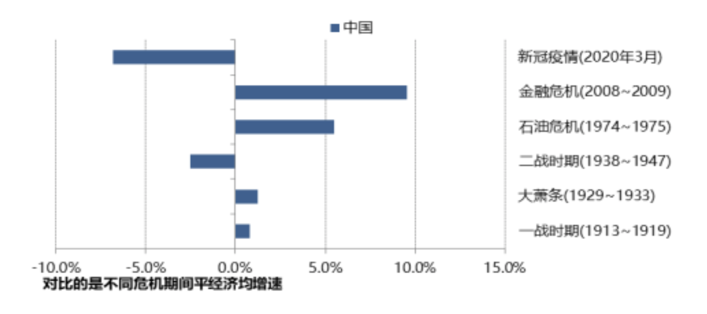 从美国来看,在这5次经济危机期间,美国平均经济增速出现了4次下降、一次上涨,其中降幅较大的分别是经济大萧条时期(1929年—1933年)下降近5%、国际金融危机时期(2008年—2009年)下降近2%以及今年一季度GDP同比下降4.95%。