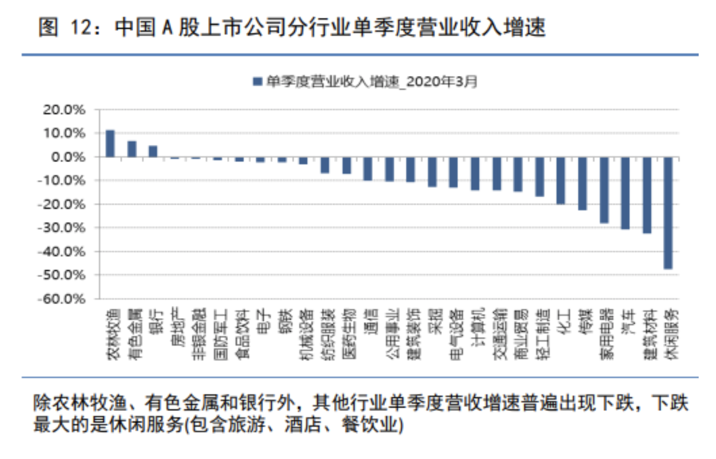 国家统计局5月18日公布的数据显示,1—4月份,全国社会消费品零售总额106758亿元,同比名义下降16.2%。从A股上市公司分行业一季度营收来看,旅游、酒店、餐饮等休闲服务业、建筑材料、汽车、家用电器等下跌最大,几乎是清一色的消费板块。