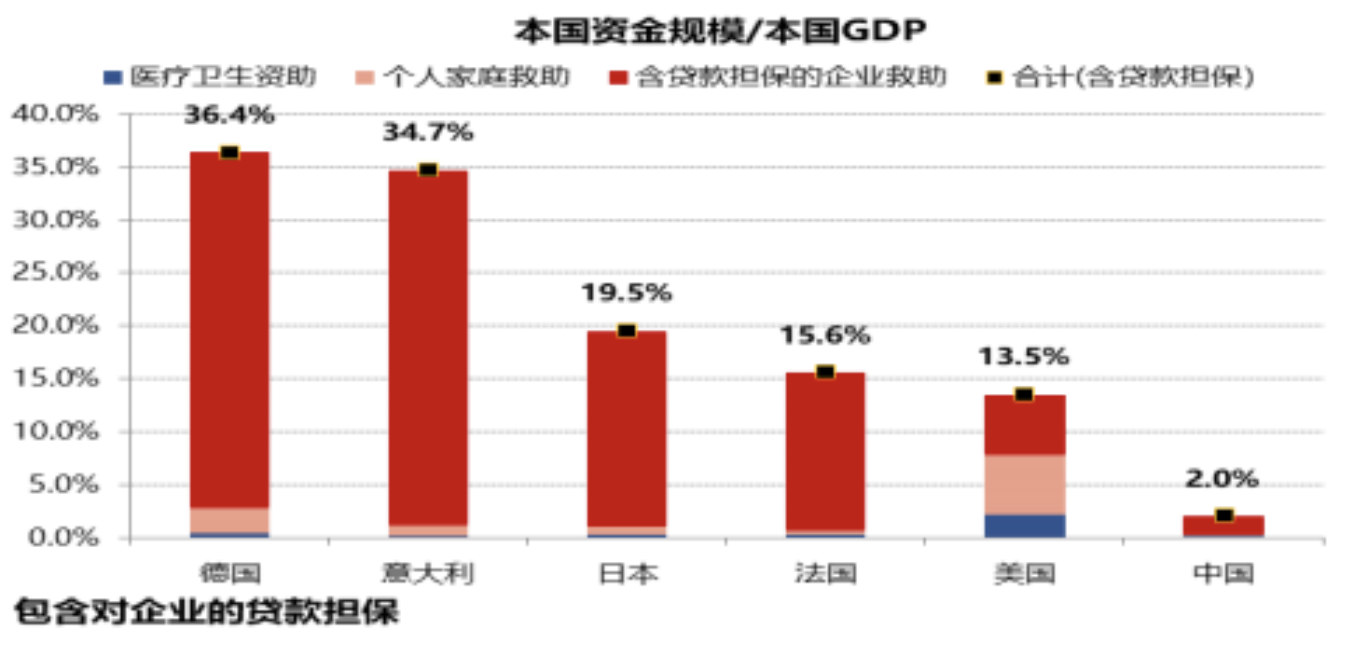 具体到个别国家,如果不包含对企业的贷款担保,美国、日本、德国的救助资金占 GDP 比例达到 10%,如果包含对贷款的担保,德国高达36%,美国和日本分别为13.5%和19%。意大利和法国不包含贷款担保的救助资金占比相对较低,分别为5%和2.7%,不过,一旦算上较可观的贷款担保,意大利的救助资金规模达到GDP的35%,法国为15.6%。
