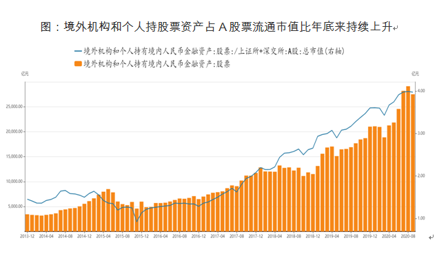 人民币升值与中国扩大金融对外开放背景下,A股注册制与退市制度的不断完善,将吸引外资A股配置。截至2020年9月,境外机构和个人持有境内人民币股票金融资产2.76万亿元,占上交所、深交所股票总市值4.0%(2015年11月,该占比只有1.2%)。
