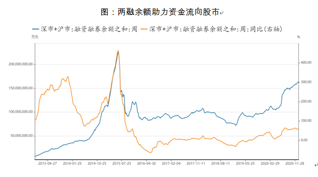 除了国内货币宽松,人民币升值预期推进海外资金流入A股外,两融余额也是观察市场情绪的一个重要变量。截至2021年1月9日当周,两融余额1.64万亿元,同比增长57.20%,但较2015年6月20日当周2.27万亿元的余额还有一定距离。