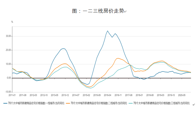 2020年6月以来,一线城市价格周期向上,二三线城市价格周期向下的格局清晰。2020年货币宽松背景下,一线城市的房价仍在上涨,并有扩散趋势。