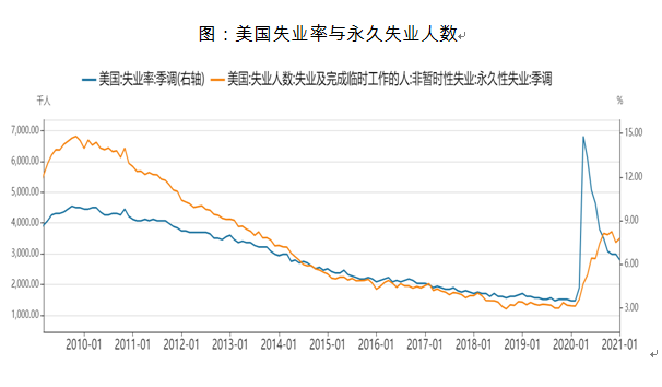 2月23日,鲍威尔向参议院银行委员会作证,“目前的经济离充分就业与通胀目标还有很长路,美联储将维持0~0.25%的联邦基金利率以及每月1200亿美元国债和MBS的购买”,“尽管经济很多部门已经修复,但底层行业失业率至少超过正常水平的20%”,从当前失业率与永久失业人数来看,美国经济尚未完全复苏。
