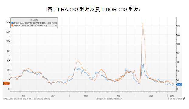 此外,美元的资金流动性依然很好,并未出现收紧的趋势,这也可能是美联储不着急出手的原因。我们从FRA-OIS利差以及LIBOR-OIS利差持续下行,可以观察到当前流动性依然偏宽松(要知道,流动性收紧、利率上行往往是泡沫的最大杀手)。