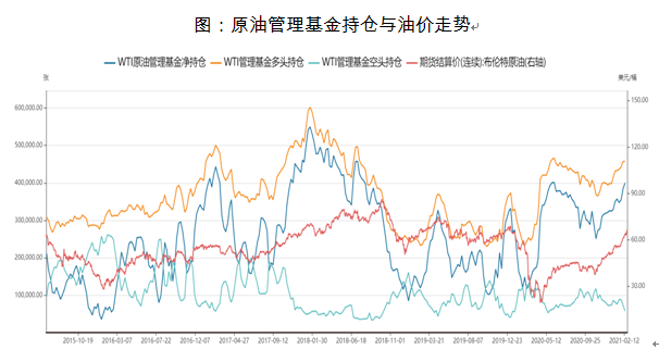 而对原油市场来讲,可能出现2017年底至2018年10月的局面,较强的基本面可能使空头持仓维持在较低位置。截至2月16日,WTI原油管理基金多头持仓45.76万张,空头持仓5.77万张,净多头持仓近40万张。当前净多头持仓已经接近2020年6月份水平,但依然低于2018年初原油多头持仓高位。当前油价很可能出现2017年底至2018年10月的情况,空头不敢进场做空,使得空头持仓持续维持在低位,而多头持仓随油价上涨出现先上后下的局面。