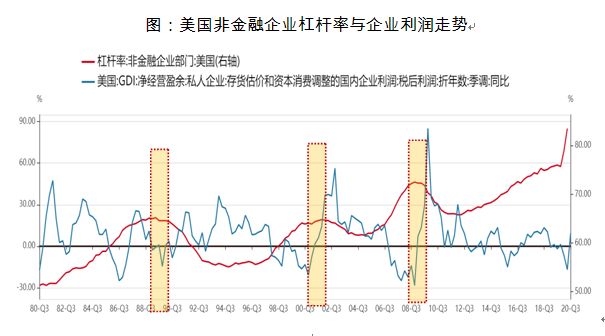 过去美国几轮经济危机均发生在企业利润同比增速持续走高,企业杠杆率不断扩张,而美联储逐渐开启升息的阶段,如下图,1990~1991年,2000年,2008年。