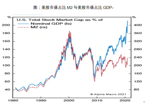 美股真正风险在于货币政策的收紧,以及短端利率与长端利率的倒挂。目前来看,大规模量化宽松尚未结束,同时,美债收益率曲线是变陡而非变平,这往往对应了资产泡沫的形成而非破灭;另外,我们观察美股市值占美国M2比率,当前美股也并不显得很贵(下图)。