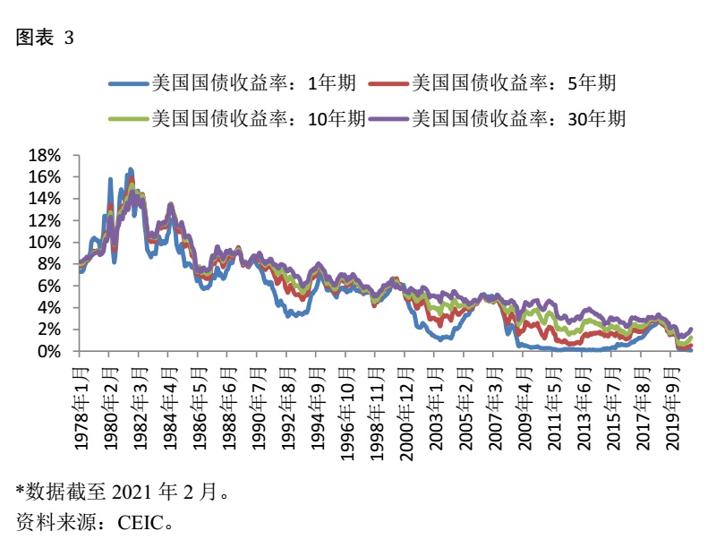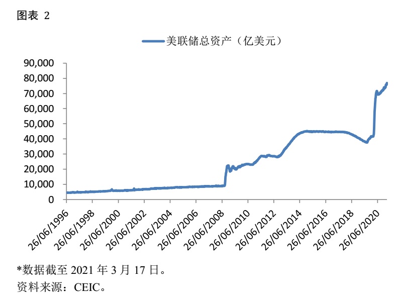 从图表 1可以看出,联邦基金利率目前处于近乎0的水平。实际上,在2008年美国金融危机发生后的很长一段时间内,联邦基金利率就停留在近乎0的水平上了。中间只是因为经济复苏短暂地加过几次息,但随着经济趋冷和新冠疫情的扩大,美联储很快再次将联邦基金利率压了下来。对美联储来说,零利率意味着传统的货币政策已基本用尽,但经济乏力迫使美联储开发了一系列的新工具,其中最重要的就是量化宽松。量化宽松就是美联储创造大量基础货币直接去市场中购买各类资产以压低这些资产的收益率,进而降低经济中的融资成本,推动经济复苏,其带来的直接后果就是美联储资产负债表的扩大。图表 2就是美联储的总资产数量,在2008年初的时候这个指标还不到9000亿美元,最新的数字已接近7.7万亿美元了,尤其是2019年开始,其几乎是直线上升。