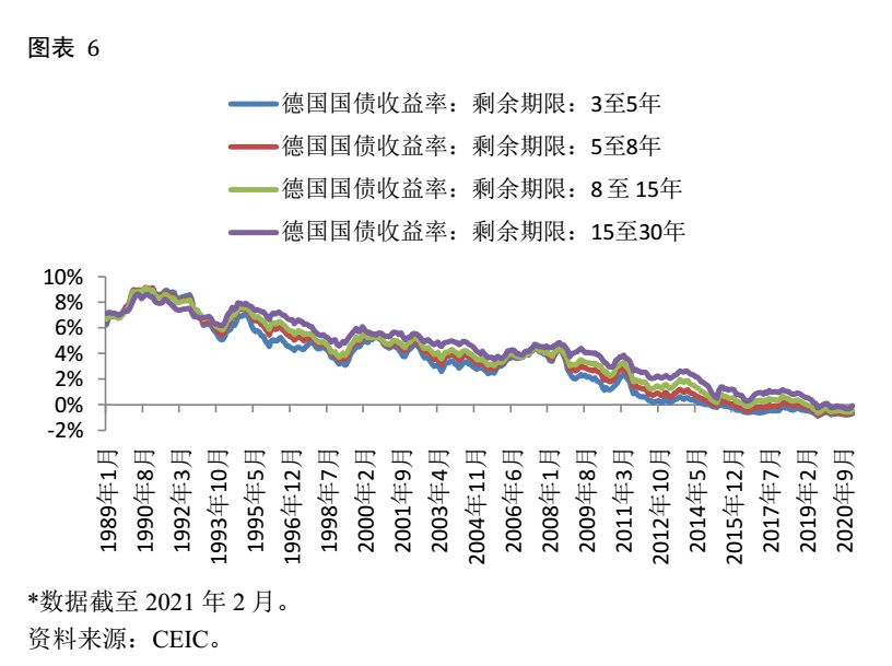 图表 4显示欧洲央行和美联储一样实行了零利率的政策,图表 5显示欧洲央行同样使用了量化宽松的政策,虽然其总规模远小于美联储,但其资产负债表也扩大了数倍之多。随着这些货币政策的使用,欧元区的国债收益率也在大幅下降,就像图表 6显示的那样。