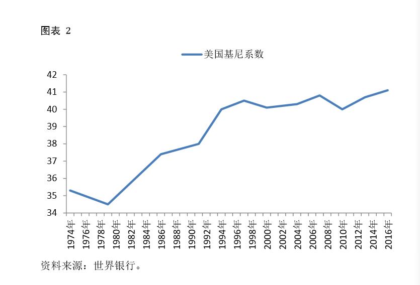 图表 2是美国40多年来的基尼系数。基尼系数是判断年收入分配公平程度的指标,基尼系数越小,年收入分配越平均;基尼系数越大,年收入分配越不平均。很明显,在这40多年的时间里,美国的贫富不均一直在不断上升。