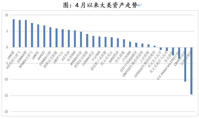 回顾4月,市场最大的变量是中美经济偏强运行,中国地产韧性带动风险资产尤其是商品价格走强,美元指数回落。4月,伦铜价格创2011年以来新高,内盘螺纹钢期货创历史新高,新加坡铁矿石期货创2013年以来新高,中国面临输入型通胀压力,引发关注。