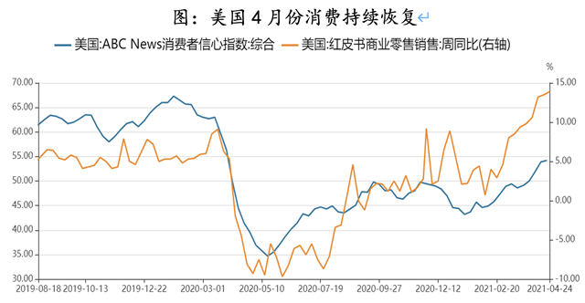 4月份美国经济如预期偏强运行。美国消费者信心指数以及红皮书商业零售销售持续上行——4月美国密歇根大学消费者信心指数收于86.50,体现了美国3月10日1.9万亿美元纾困落地后,消费持续快速复苏。