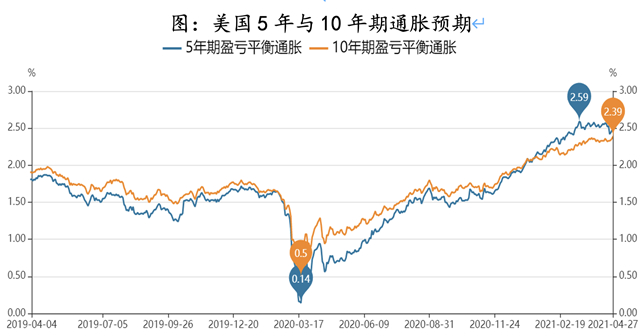 随着消费复苏,美国通胀预期也在不断抬升。1.9万亿美元财政纾困推动美国居民“收入-消费-通胀”的循环上升,3月份美国CPI为2.6%,超过预期的2.5%,环比上涨0.60%,而美国5年期盈亏平衡通胀在3月中旬创下2.59%的历史新高。