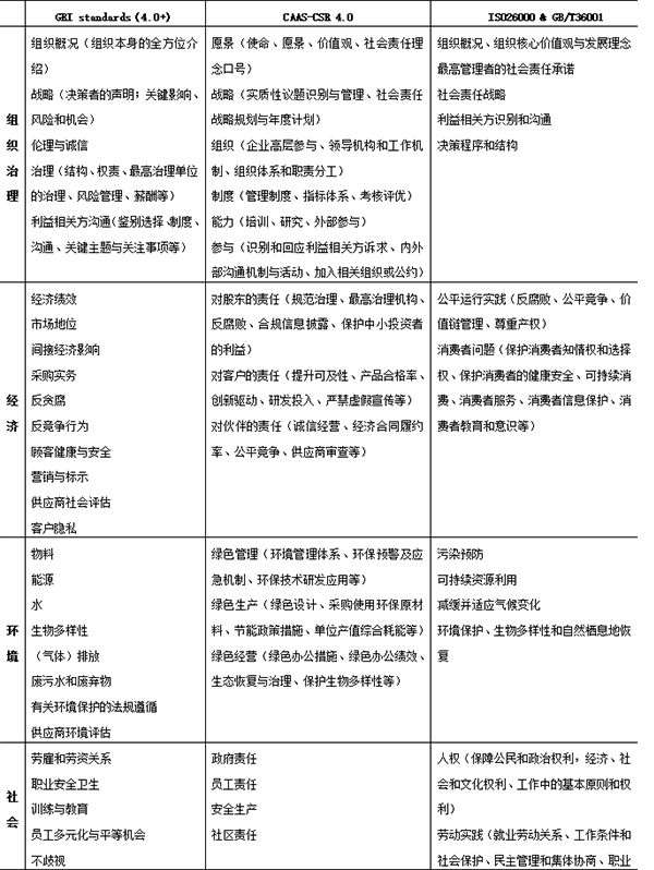 从具体的议题来看,无论是ISO26000与企业相关的议题,还是GRI系列的议题框架,都非常一致地从四个维度来描述企业的社会责任,同时也是推动可持续发展的努力方向,即组织治理、经济、环境和社会。这些维度涵盖了企业所有的利益相关方,成为目前主流的企业社会责任讨论维度。以下内容将对这几项报告标准在四个维度的具体要求做一个对比和说明。