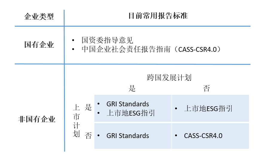 第一,根据企业的类型。针对国有企业,国资委曾于2007年发布《关于中央企业履行社会责任的指导意见》和2016年发布《关于国有企业更好履行社会责任的指导意见》(合并简称为“国资委指导意见”),为国有企业在履行社会责任并制作报告时提供了大致的方向。根据国资委2019年截止到8月的统计来看,国有企业使用最多的两份参考标准是《国资委指导意见》和中国社科院《中国企业社会责任报告指南(CASS-CSR4.0)》。对于非国有企业,选择则更加灵活,可以再依据以下几项来考虑。