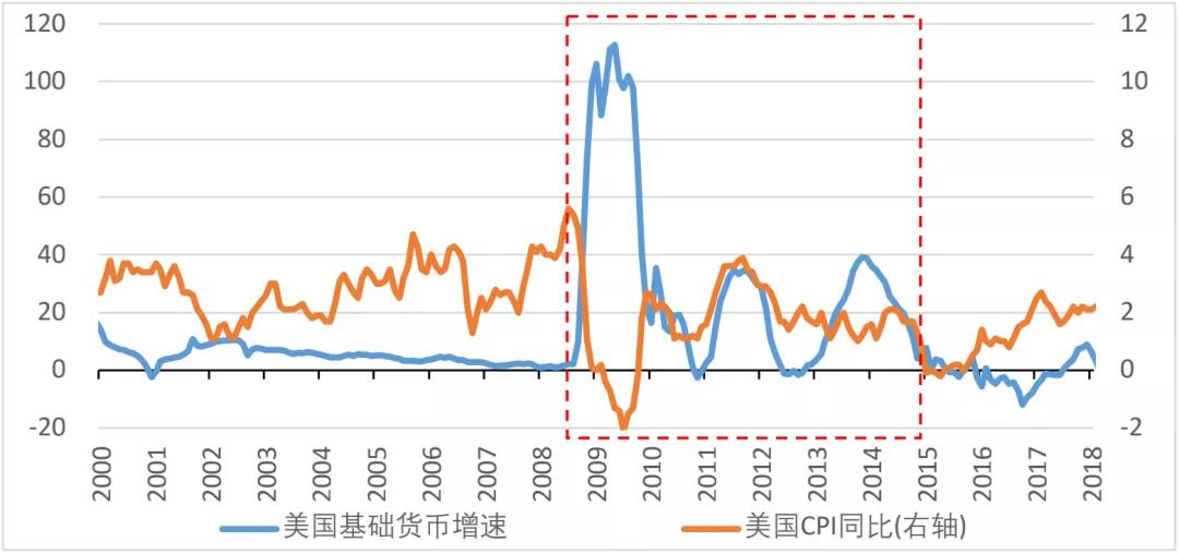 1990年日本股市和地产泡沫破裂,1999年经济陷入通缩,2001年3月份日央行首创“量化宽松”(Quantitative easing, QE),即直接购买日本长期国债,购买目标从4.8万亿日元/年一路提高至14.4万亿/年,带动日本基础货币增速一度升至45%。然而日本通胀却持续停留在负值区间,完全没有起色(图1)。这是为什么呢?