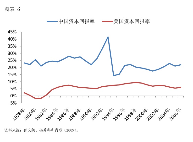 行文至此,笔者有一个奇怪的问题:中国相对于美国来说是一个穷国,但这个穷国却大量持有美国国债(图表 5),这等于说是在借钱给美国,穷人借钱给富人,这似乎有违常识。更重要的是,在过去30年的时间中,中国经济作为世界经济的明星,有着其他国家难以望其项背的经济增速,资本在中国的回报率远高于美国(图表 6)。在这种局面下,中国应该是一个净资本流出为负数,即资本净流入的国家,而不是像现在这样,净资本流出为正数。