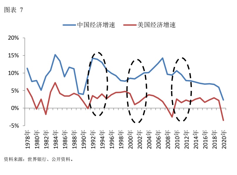 在当今世界,大多数发达国家选择的都是自主的货币政策和资本自由流动,放弃了固定汇率,实行的是浮动汇率制度,换句话说,央行放弃了汇率目标;有少数经济体选择了固定汇率制度和资本自由流动,放弃了自主的货币政策,例如中国香港所实行的联系汇率制度,就将港元与美元挂钩,香港的货币政策实际上就是美国的货币政策;也有少数经济体选择了自主的货币政策和固定汇率,放弃了资本的自由流动,这方面的例子就有中国,但在实践中,中国的做法又有其独特性。中国实行的是有管理的浮动汇率,而这种制度具有固定汇率的色彩。更重要的是中国并没有实施严格意义上的资本管制??既管住资本的流入也管住资本的流出。中国的资本管制是单向的,鼓励流入但不鼓励流出,这导致中国的货币政策受到了美联储货币政策的强烈影响,货币政策的自主性受到损害。假如中美两国的经济周期是一致的,那么这么做没问题,但历史数据表明中美的经济周期经常不在一个节奏上(图表 4),这就意味着适合美国的货币政策未必会适合中国,而这容易导致中国经济出现过热或者过冷。