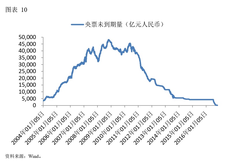 除此以外 ,在过去多年的时间中,由于外汇储备激增带来了大量的外汇占款,这对央行来说属于严重的被动发行货币(图表 8)。为了冲销这些被动发行的货币,央行不得不大规模提高法定存款准备金率(图表 9),并发行央票回笼货币(图表 10),这些政策给央行造成了极大的负担,假如人民币可以通过升值的方式来应对这些流入的外汇,那么这就相当于给央行解了困。