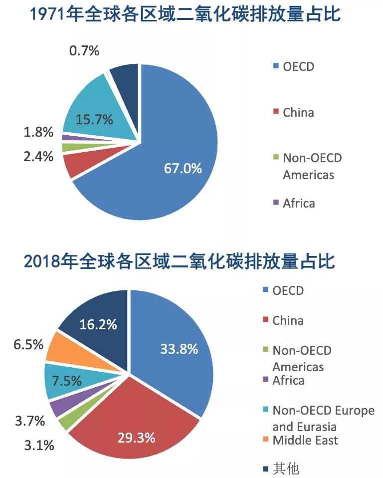 以现在的碳排放量来看,中国是目前最大的碳排放国,2019年排放量占全球27.9%(美国占14.5%),其它发展中国家的碳排放也在持续增长。