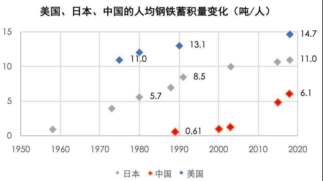从钢铁制品存量看,日本的人均钢铁存量约为11吨,中国的人均存量约为6吨,按照中国现在的钢铁产量来推算,约10年内中国的钢铁存量就可以达到代表发达国家标准的日本的水平;