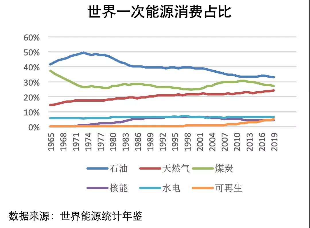 以2019年全球一次能源消费结构为例:石油、煤炭和天然气分别占33.1%、 27.0%和24.2%,光伏、风能和水电等可再生能源加总只有11.4%。