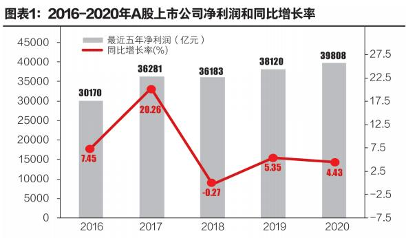 在这样的形势下,A股上市公司的盈利情况是怎样的呢?截至2021年6月15日,全部A股4287家公司中,只有易见股份一家还未披露2020年年报。从当前的数据看,2020年,A股上市公司实现净利润3.98万亿,同比增长 4.43%,增长率只比 2019年的5.35%,下降了不到1%。