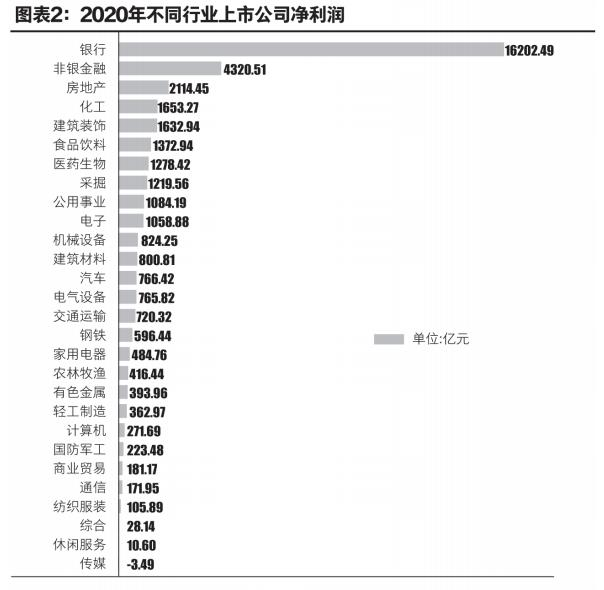 图表1是2016至2020年A上市公司的归属母公司净利润及其同比增长率。总体上看,2020年A股上市公司合计实现净利润3.98万亿元,同比增长4.43%。虽然在2020年整个经济体都受到了新冠疫情的冲击,但是上市公司的盈利并未受到太大影响,同比增长率与2019年相比只下降了不到1%。