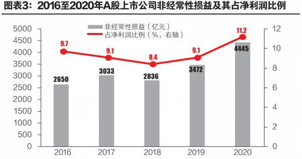 图表3是近五年A股上市公司的非经常性损益金额及其占净利润的比例。2020年,A股上市公司的非经常性损益共4,445亿元,同比增长28.02%。