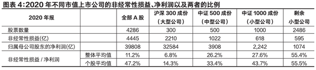 在图表4中,我们把已公布2020年年报的4286家上市公司分成四类:大型公司即沪深300成份股、大中型公司即中证500成份股、中小型公司即中证1000成份股以及剩余小型公司,计算不同板块的非经常性损益占净利润比例的整体平均值,即板块内公司的非经常性损益之和除以净利润之和。同时,我们也计算了每个公司非经常性损益占净利润的比例,并进一步计算不同板块内比例的平均值。