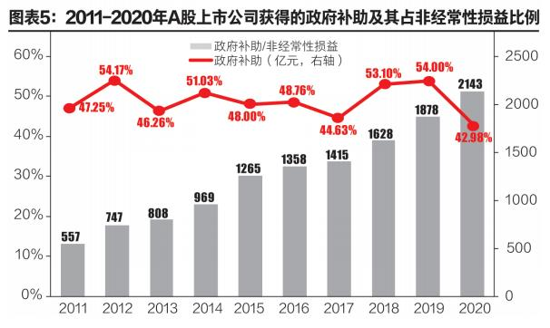 上市公司非经常性损益中有很大一部分是政府补助。政府补助指的是企业从政府无偿取得的资产,主要包括:财政贴息、研究开发补贴和政策性补贴。图表5是2011至2020年A股上市公司获得的政府补助及其占非经常性损益比例。从2011起,非经常性损益中大概有一半是政府补助。在2020年,获得政府补助的上市公司共有4240家,占比98.90%;其中中国石化获得了86.05亿元政府补助,排在首位。上市公司共获得政府补助2,143亿元,这一金额超过2020年的1878亿元,创出新高;政府补助占非经常性损益的比例是42.98%,与往年相比,稍有下降。