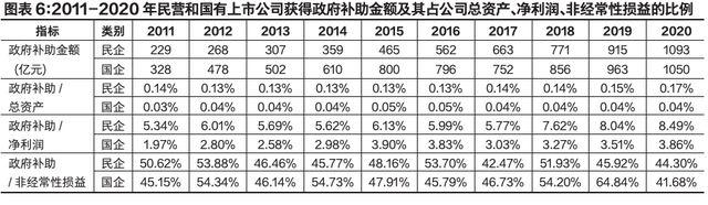 图表6是2011至2020年民营和国有上市公司获得的政府补助金额及其占公司总资产、净利润、非经常性损益的比例。其中,政府补助占总资产比例是所有民营和国有上市公司的政府补助金额之和除以相应的总资产之和,占净利润、非经常性损益的比例也类似地计算。