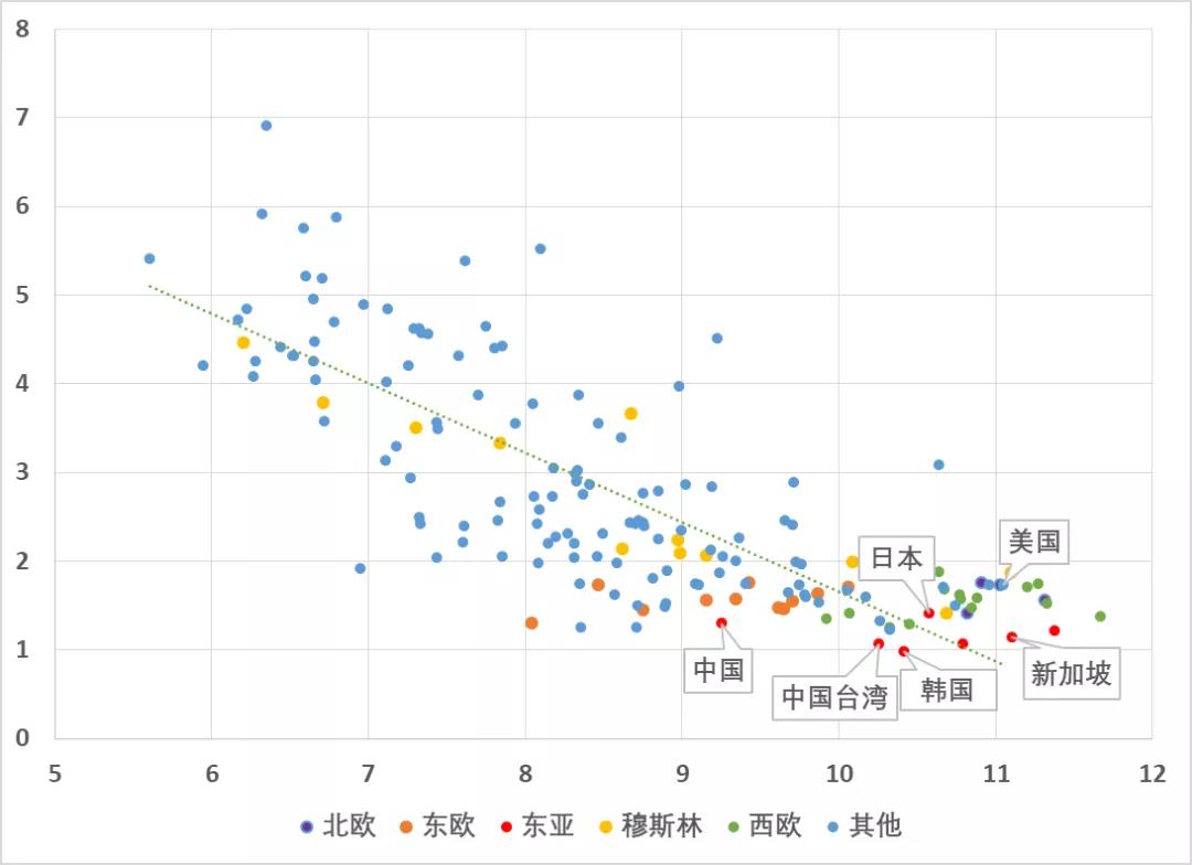 数据显示,一贯认为少子化极度严重的日本,实际上是“合格生”,其1.4的生育率还要高于其人均GDP3.9万美元所对应的理论生育率。此外,美国、新加坡生育率也在理论水平之上。